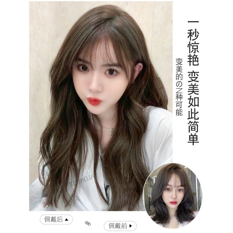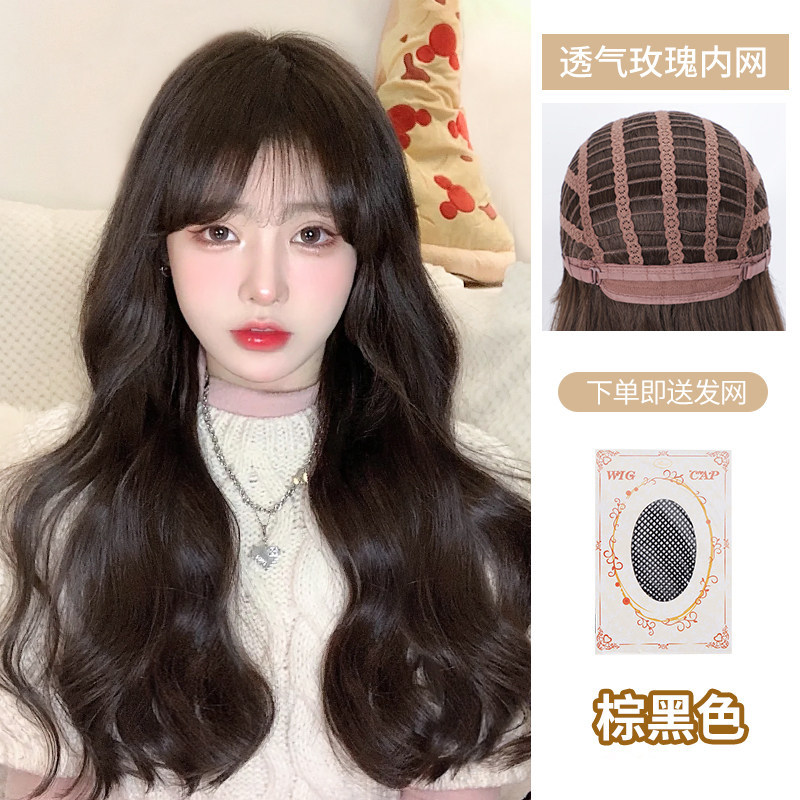 - Wig hairstyle: long curly hair with oblique bangs