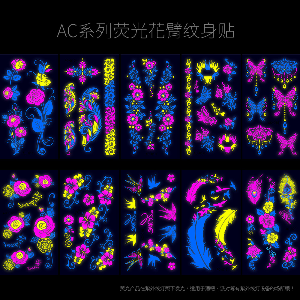 - Pattern: AC001-010 fluorescent tattoo sticker combination set (take 10 photos in one set)