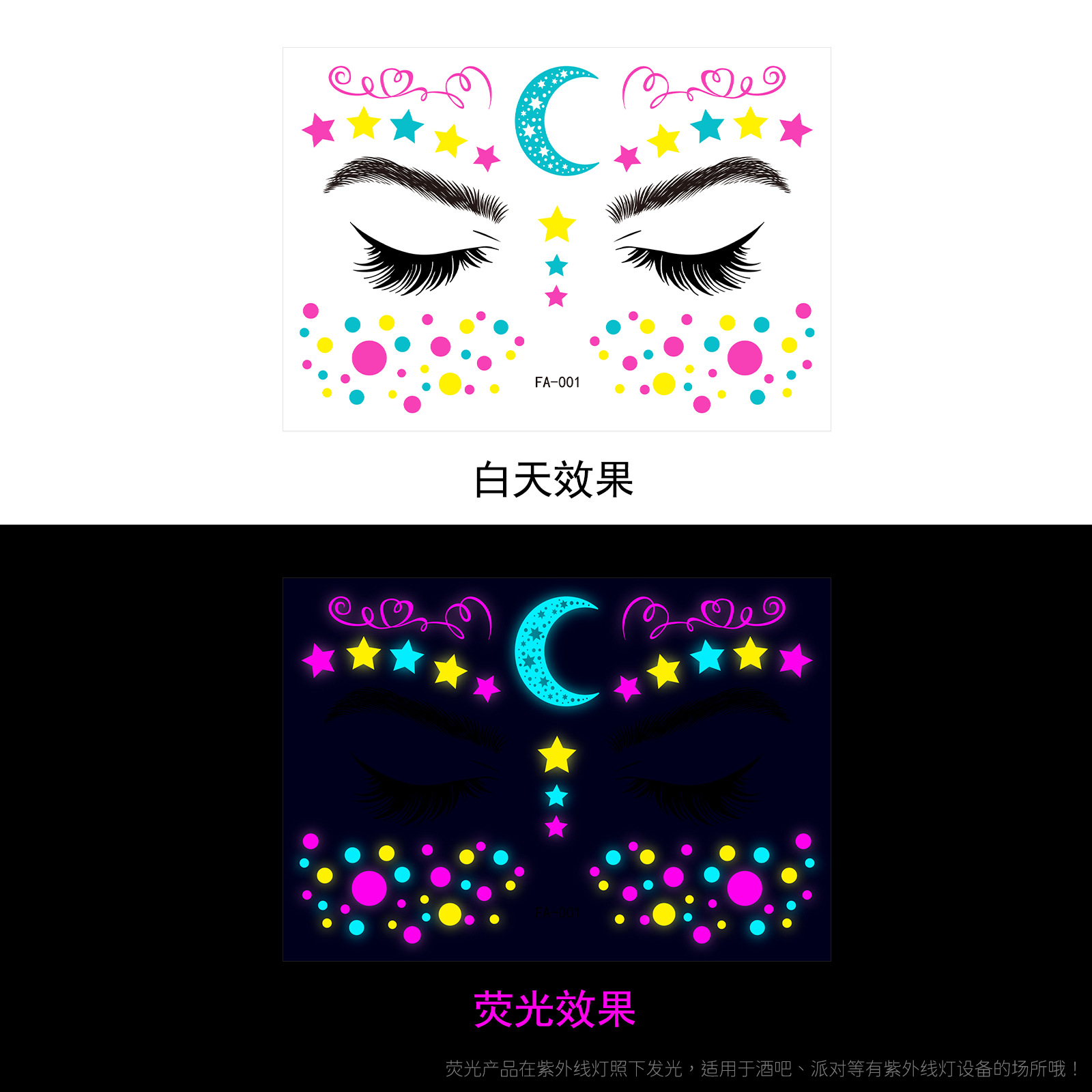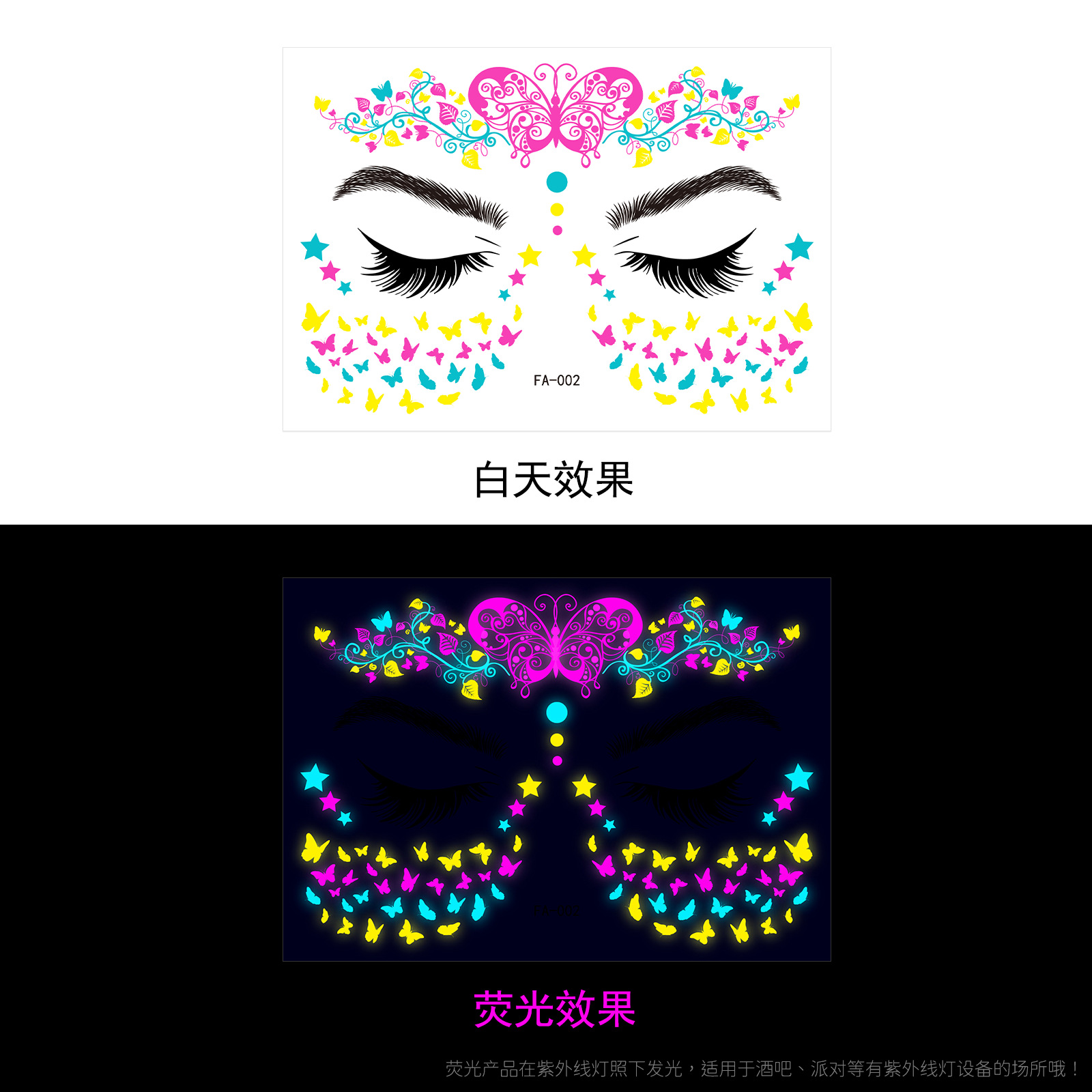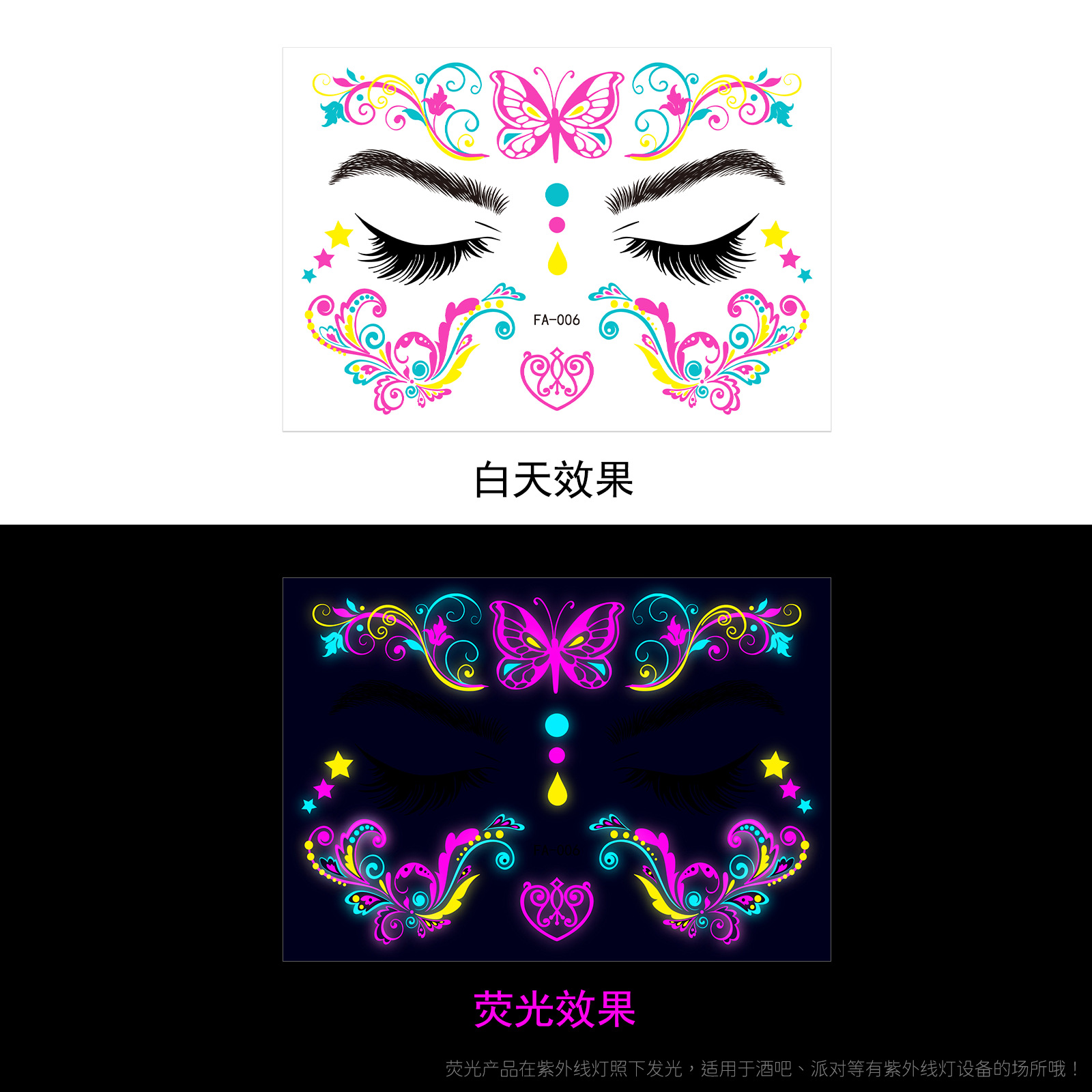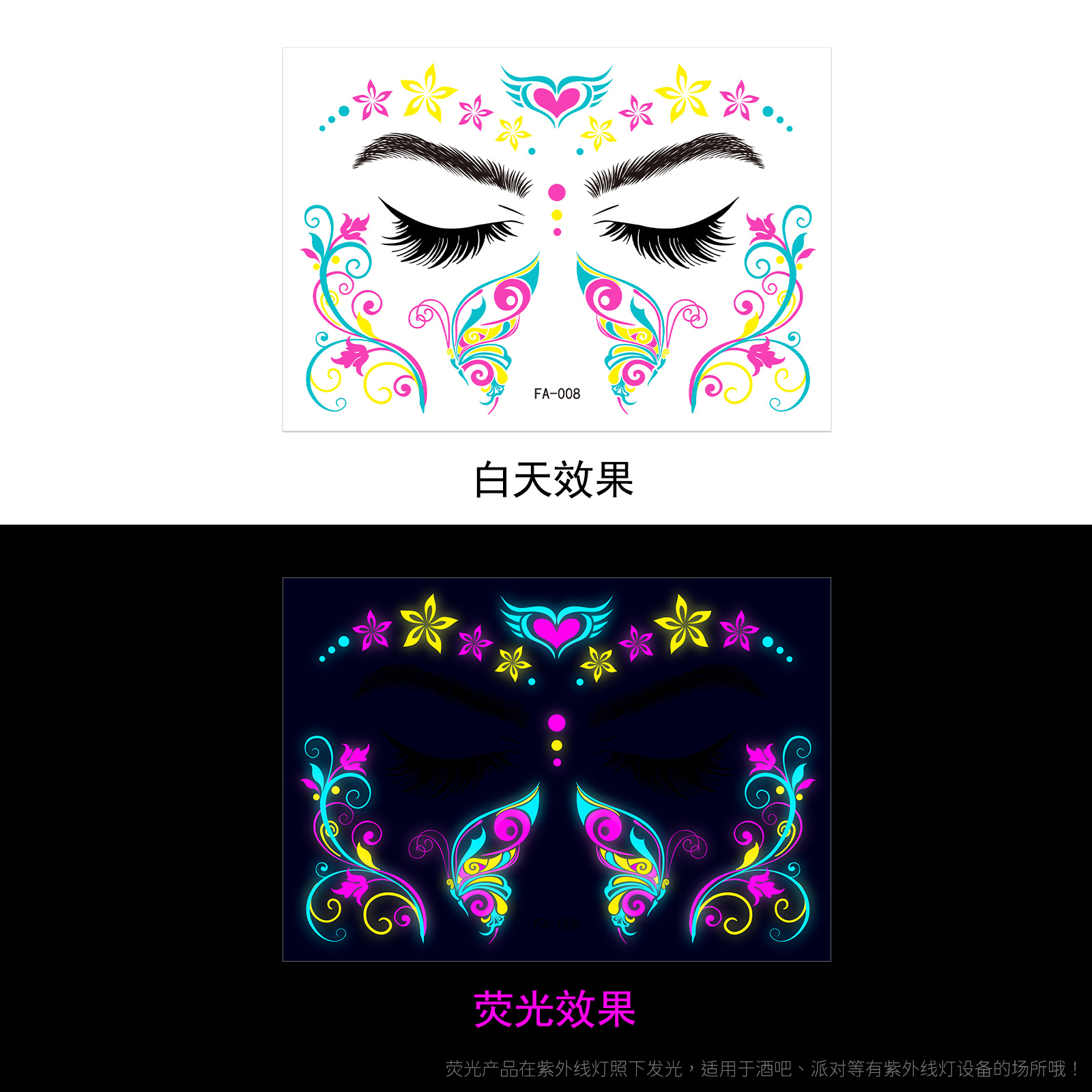 - Pattern: (take 8 photos in a set) Fluorescent face sticker FY001-008 combination set