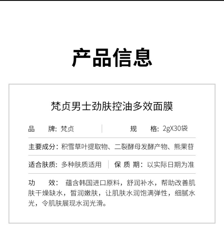 - Product specifications: Men's skin-energizing and oil-controlling multi-effect facial mask 2g × 30 bags