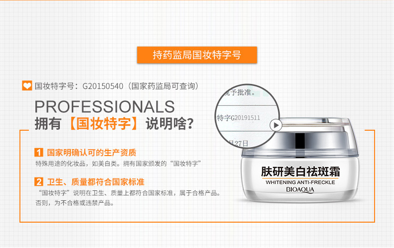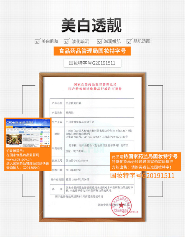 - Special Purpose Cosmetics Certificate Number: National Cosmetic Special Character G20150540