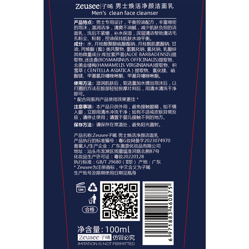 - Product Specifications: Men's Facial Cleanser 100ml
