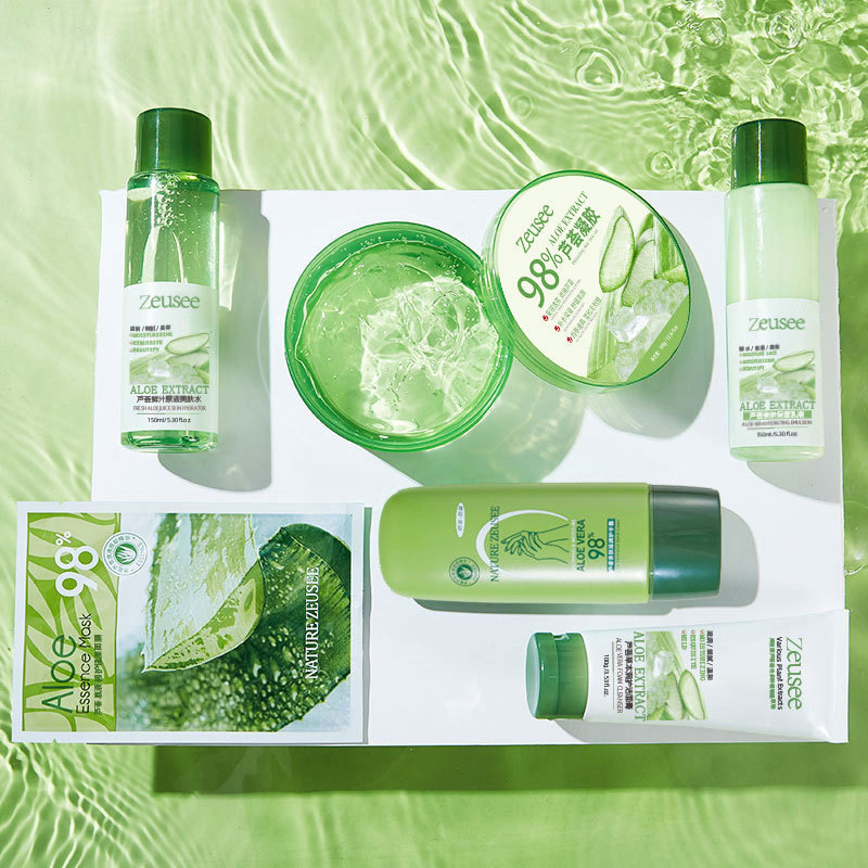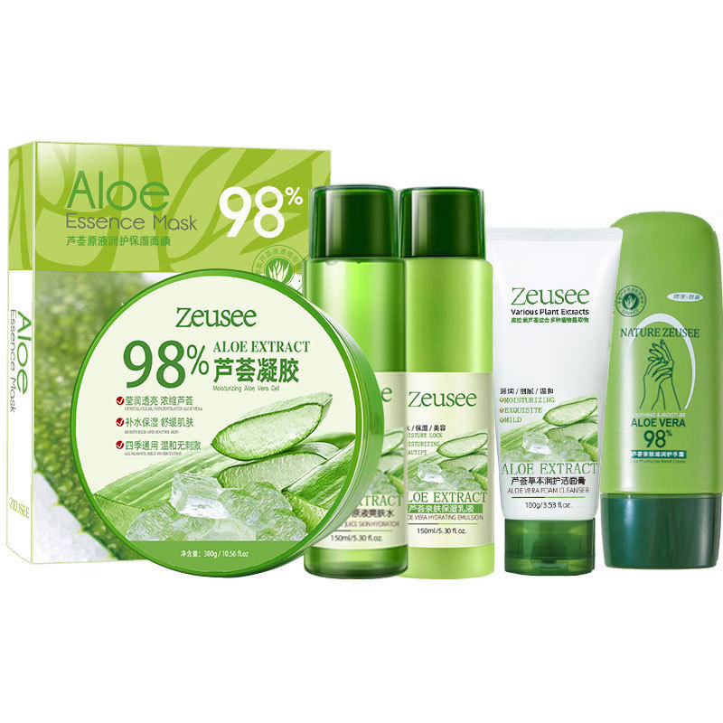 - Net content: Aloe vera gel 300g + facial cleanser 100g + aloe vera water 150ml + aloe vera lotion 150ml + facial mask 5 sheets/box + hand cream 100ml