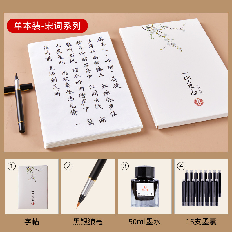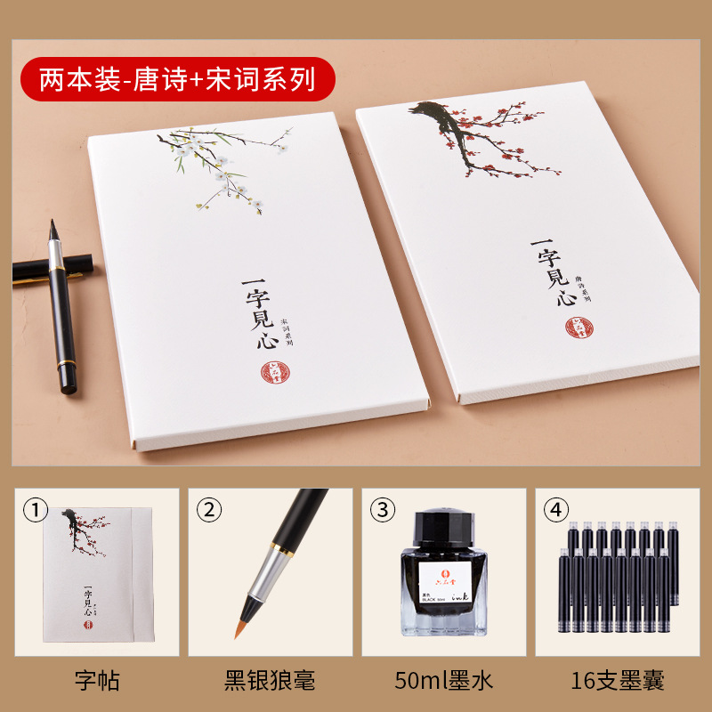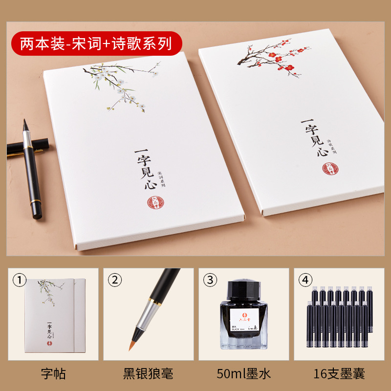 - Specification: Selected Tang Poetry + Selected Song Lyrics【40 Poems/5 Repetitions】Small-Kai Script Calligraphy Set (Pen-Type Brush + Ink + Ink Sac)