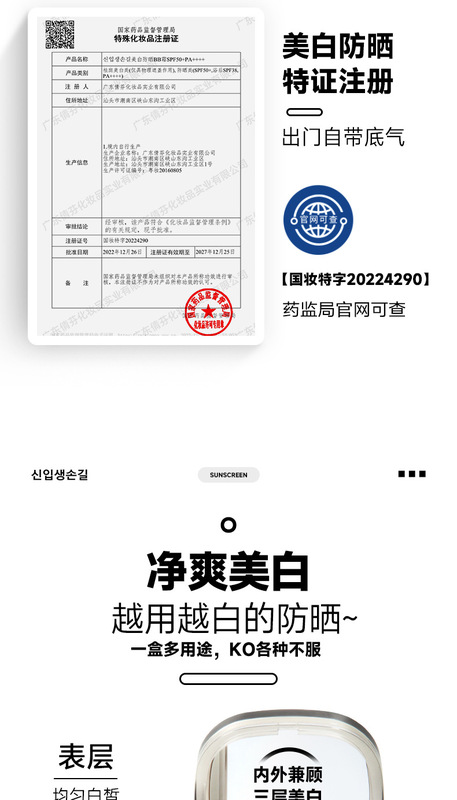 - Special purpose cosmetics certificate number: National cosmetics special character 20222277