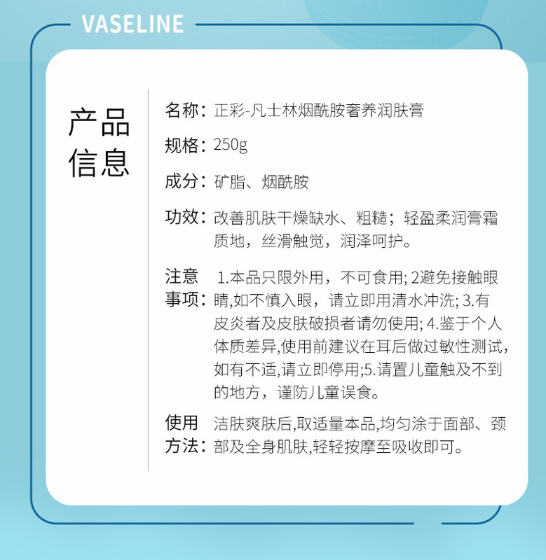 - Product Specification:Vaseline Nicotinamide Moisturizing Cream 250g【Zhengcai】