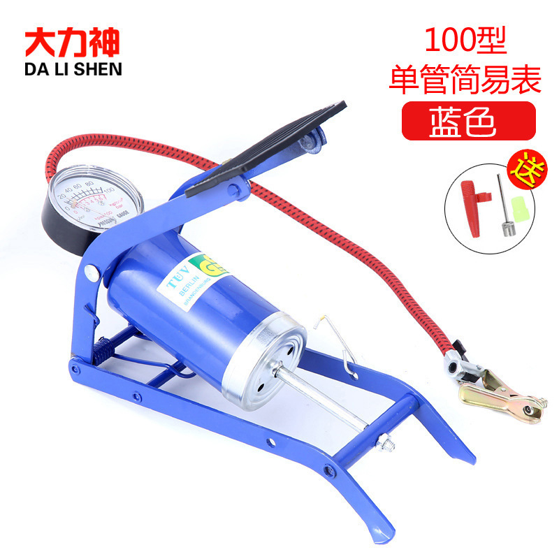 - Specifications: Small blue single-tube foot pump