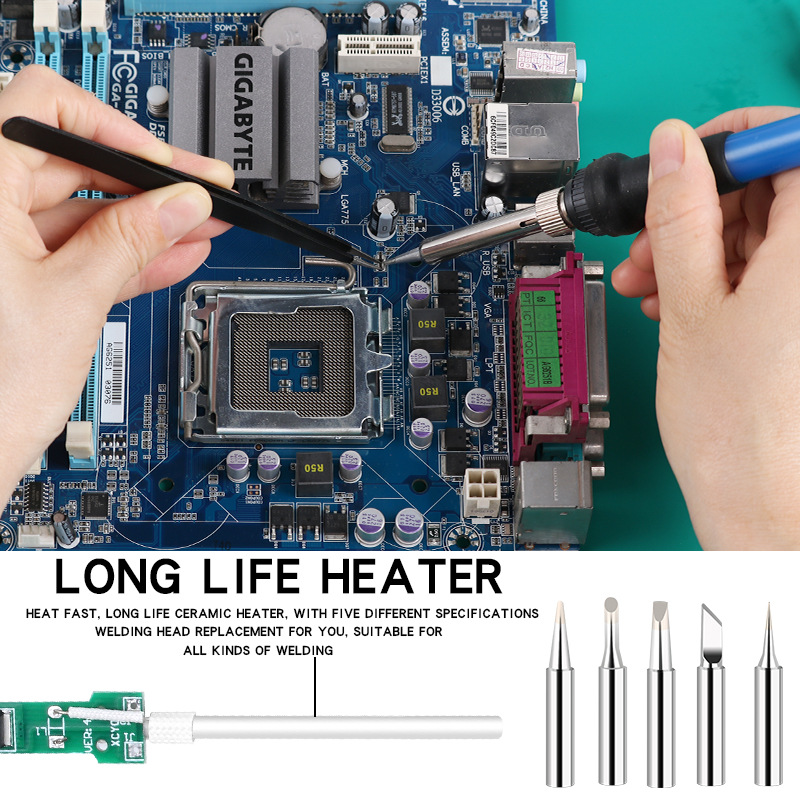 - Model: 806 American standard soldering iron+five sets of 936 soldering iron heads+two 10g tin pens with blue covers+G-shaped soldering iron holder