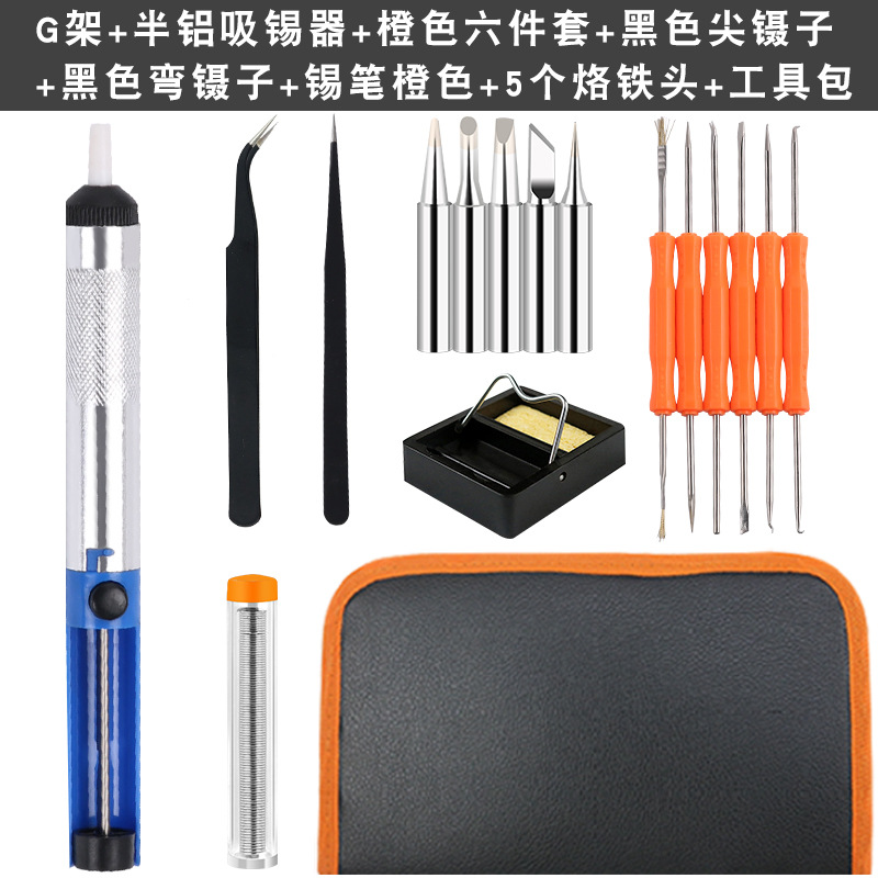 - Model: Half aluminum solder absorber+curved tweezers+pointed tweezers+orange tin pen+5 soldering iron heads+G-shaped soldering iron holder+tool kit