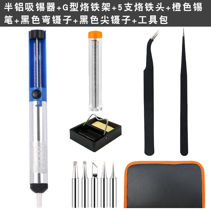 - Model: Half aluminum solder absorber+5 soldering iron tips+blue soldering tool+G-shaped frame+curved tweezers+pointed tweezers+orange tin pen+tool kit