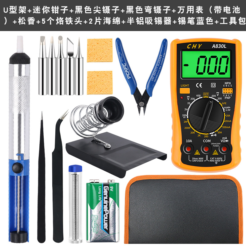 - Model: U-shaped frame+mini pliers+black pointed tweezers+black curved tweezers+multimeter (with battery)+rosin+5 heads+2 sponges+semi aluminum tool+tin pen blue+tool kit