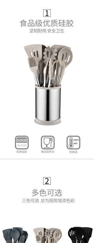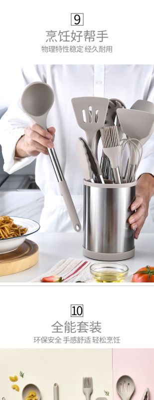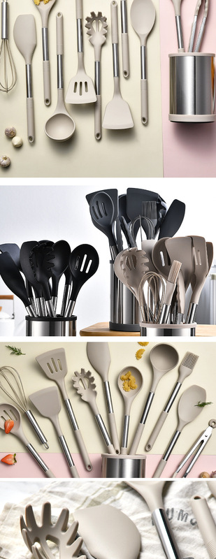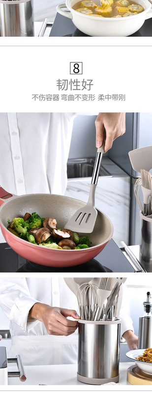 旋轉桶:287g,油刷:57.3g,小湯勺81.7g,漏鏟81.6g,打蛋器:36.8g,食物夾:116.4g,平頭鏟:80.5g,意粉抓:86g,漏勺:77.2g,鍋鏟:85.6g,湯勺:98.9g, 刮刀:108.6g