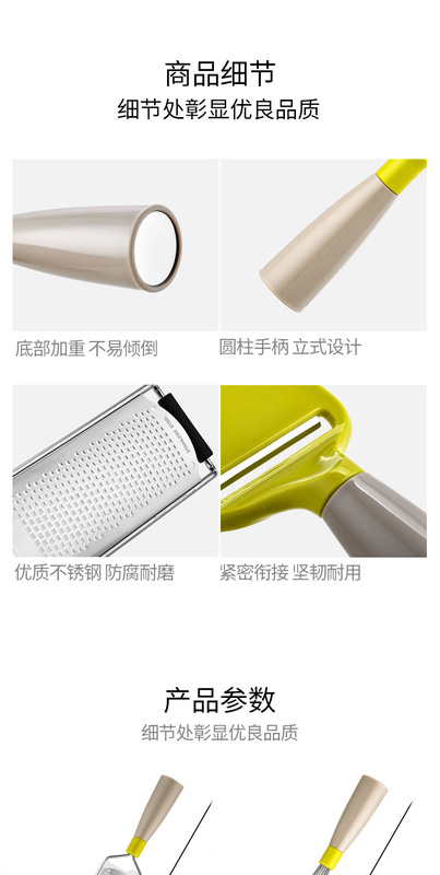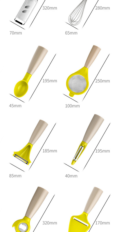 bottle opener: 89g, cross plane 65g, Y-type plane 71g, juicer 64.5g, fruit extractor 57g, ice cream scoop 70.5g, cake cutting wheel 84g, cheese shovel 75g, filter 92g, egg beater 85g, cheese plane 125g
