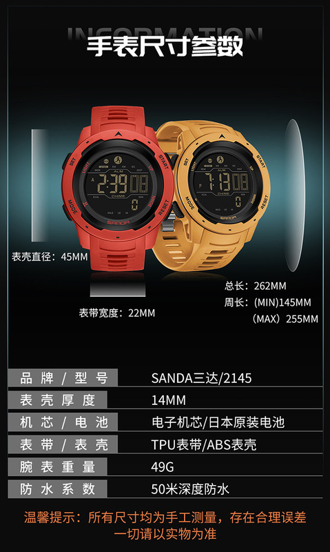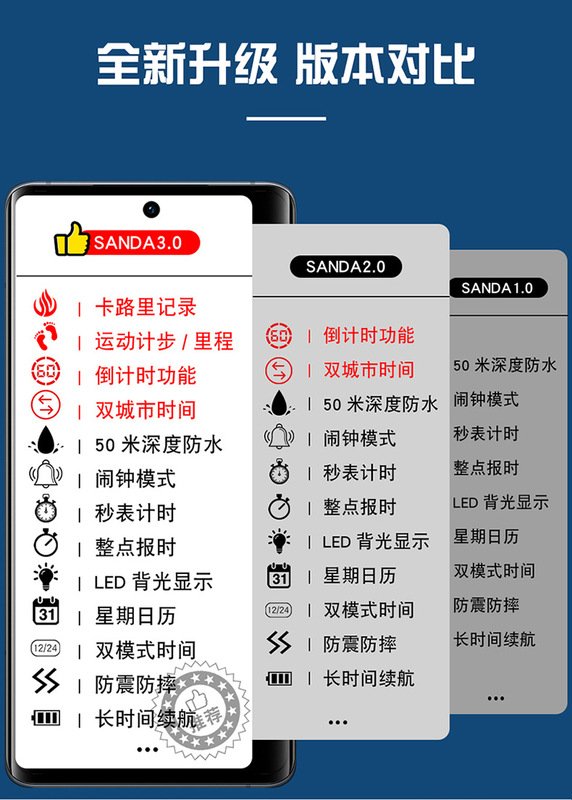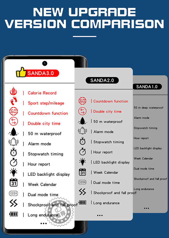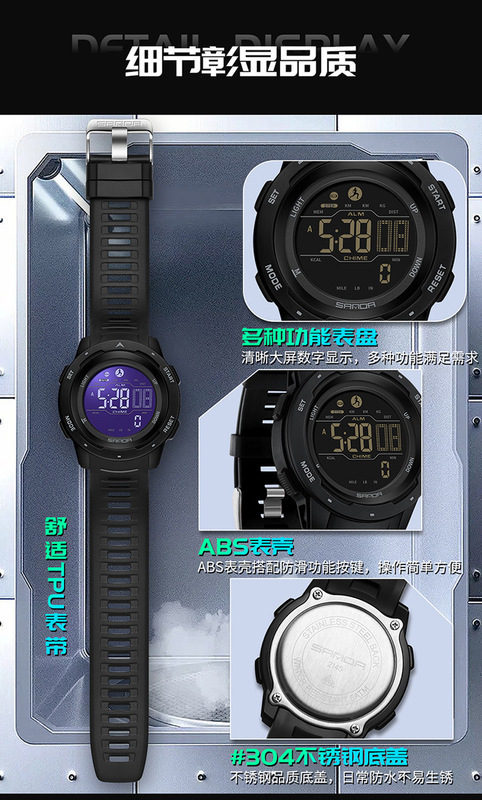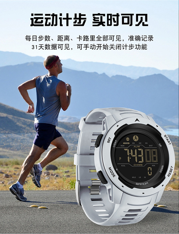 - 特殊功能:計步,卡路里,跑秒,鬧鐘,倒計時,第二時間顯示