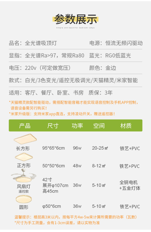 - Light source power: four rooms and two living rooms (the fan light is a remote control model)