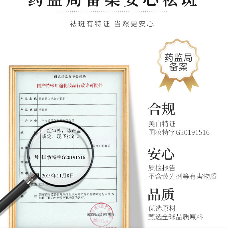 - Special purpose cosmetics certificate number: National cosmetics special character G20191516