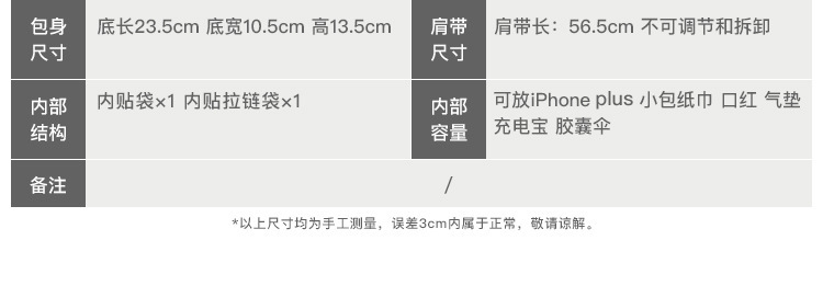 - Internal structure of the bag: Zipper secret pocket