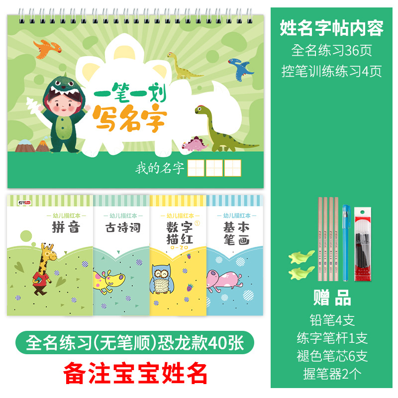 - Specifications: Contains 54 stroke order dinosaur pictures + four red drawing books (please note the baby’s name)