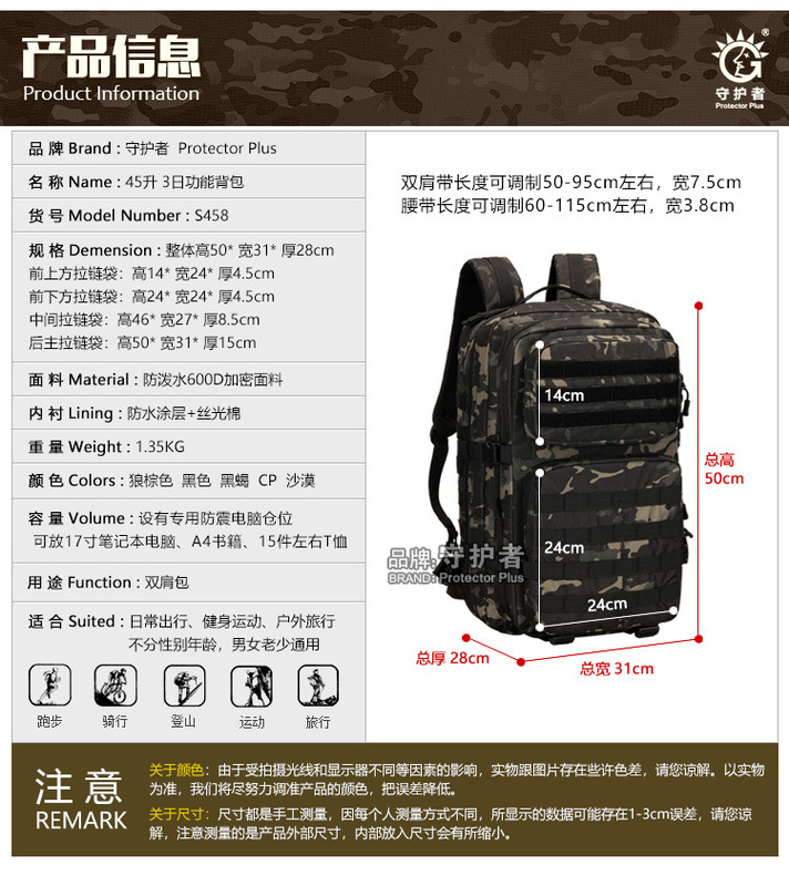 - Model: S458-45L 3-day functional backpack