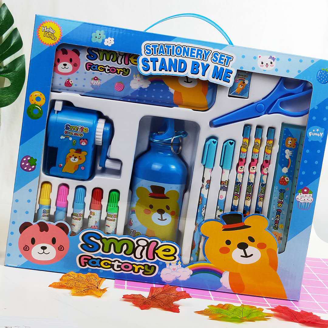 - Components: kettle, 1 pencil sharpener, 1 pencil case, 1 gel pen, 2 pencils, 3 scissors, 1 ruler, 1 eraser, 1 watercolor pen, 6 colors