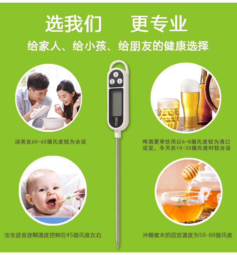 - 適用範圍:水溫,油溫,奶溫,廚房,烘焙,麵團,工業,土壤,堆肥