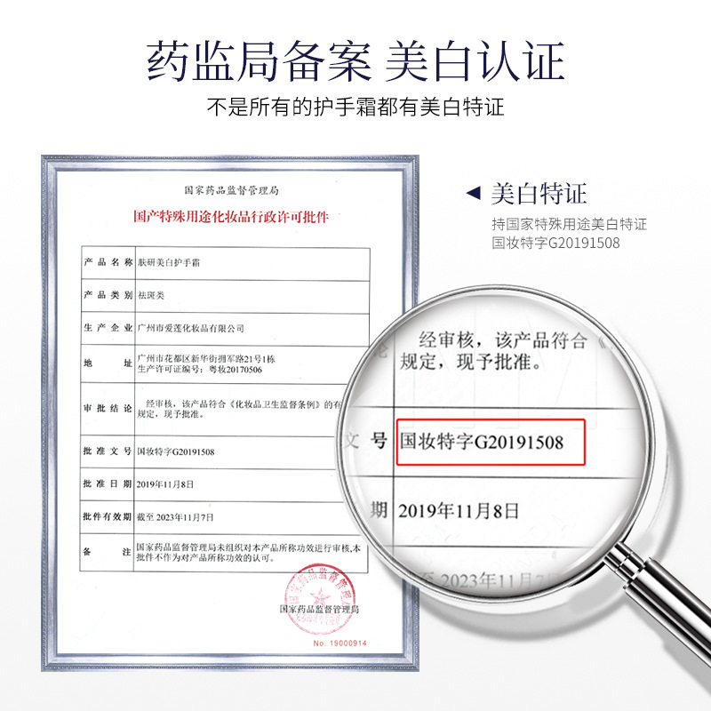 - Special Use Cosmetics License Number: National Cosmetic Special Character G20191508