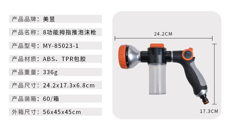 - Specifications and models: 8-function thumb push foam gun