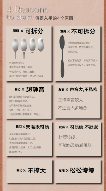 - 功能及用途:聲波吸吮、震動、磁懸浮脈衝炮機