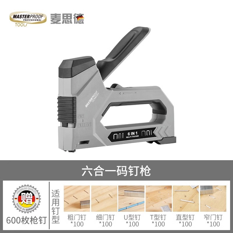 - Specification: Standard 6-in-1 Staple Gun (100 staples of each of 6 types included)