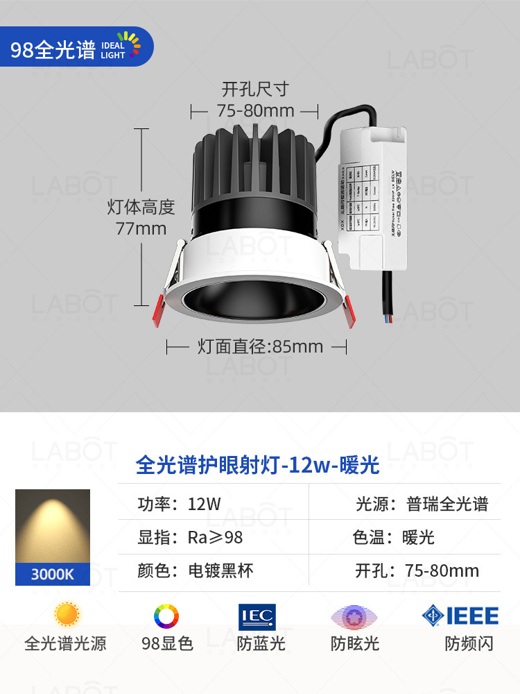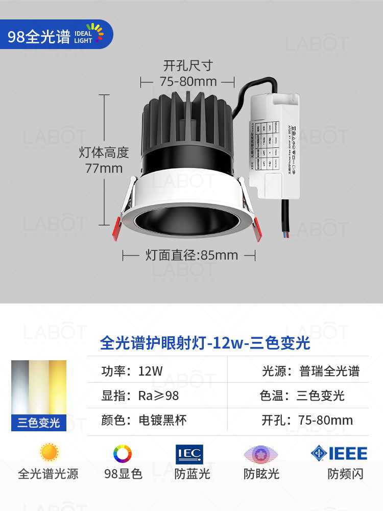 - Power: Full Spectrum Spotlight【Black Cup 12W-Three-Color Variable Light-RA98 CRI】