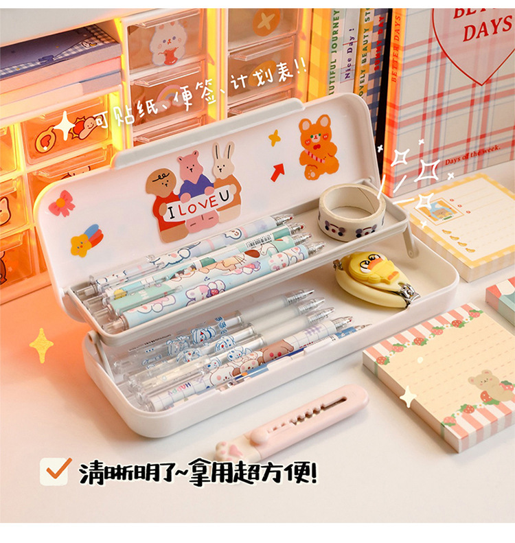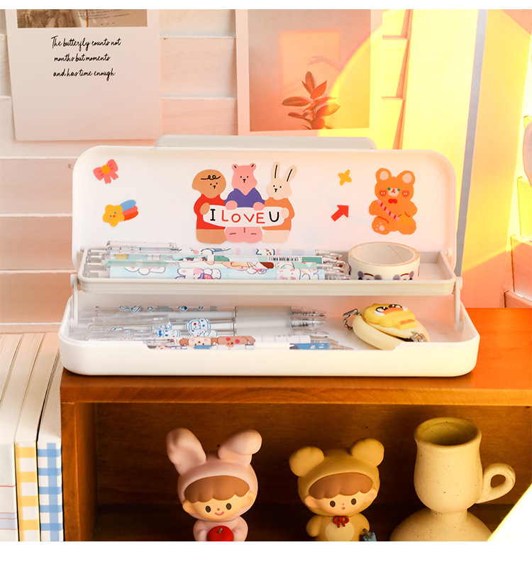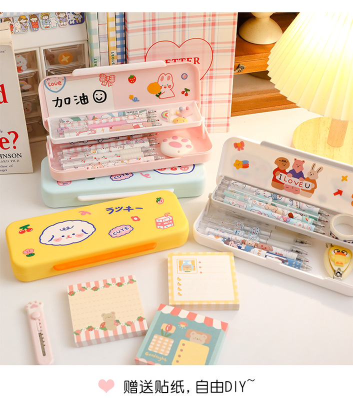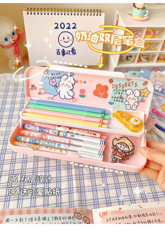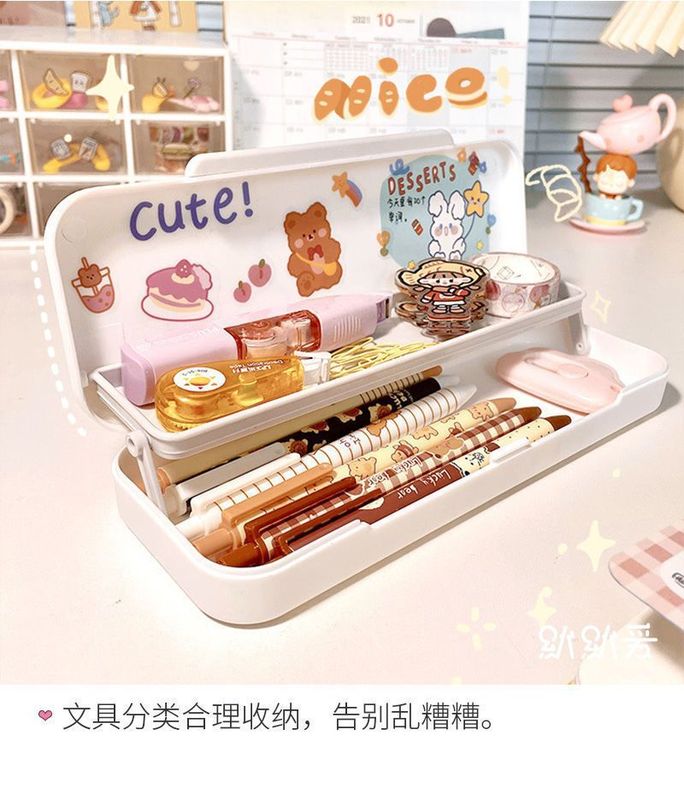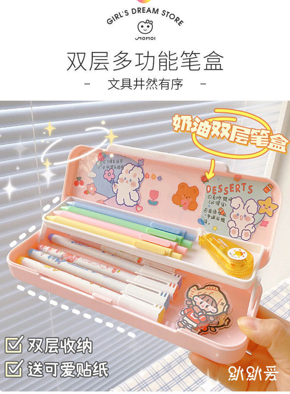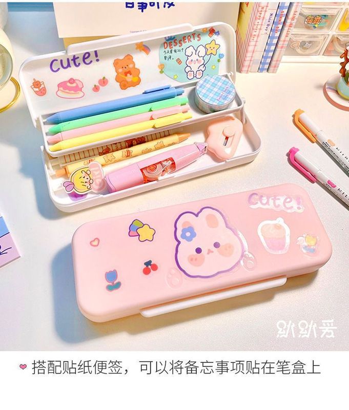 - Specifications: [Pink + Cream White] Double-layer pen box + 2 stickers and 8 patches