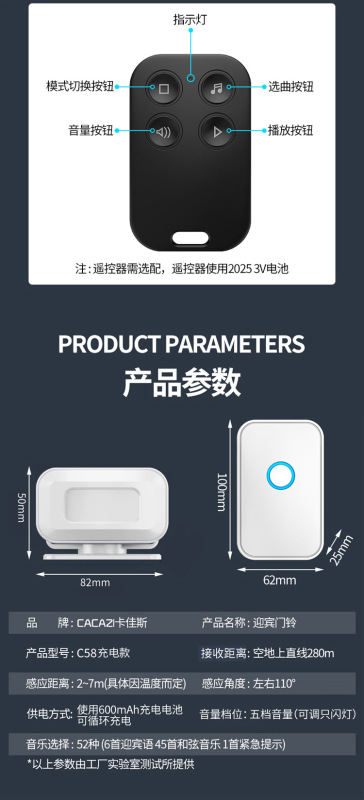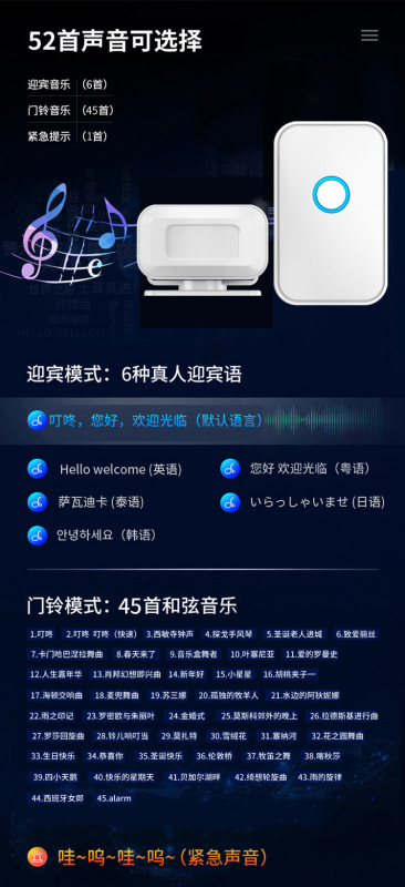- Ringing: 52 kinds of music, 5 volume levels adjustable to only flash lights