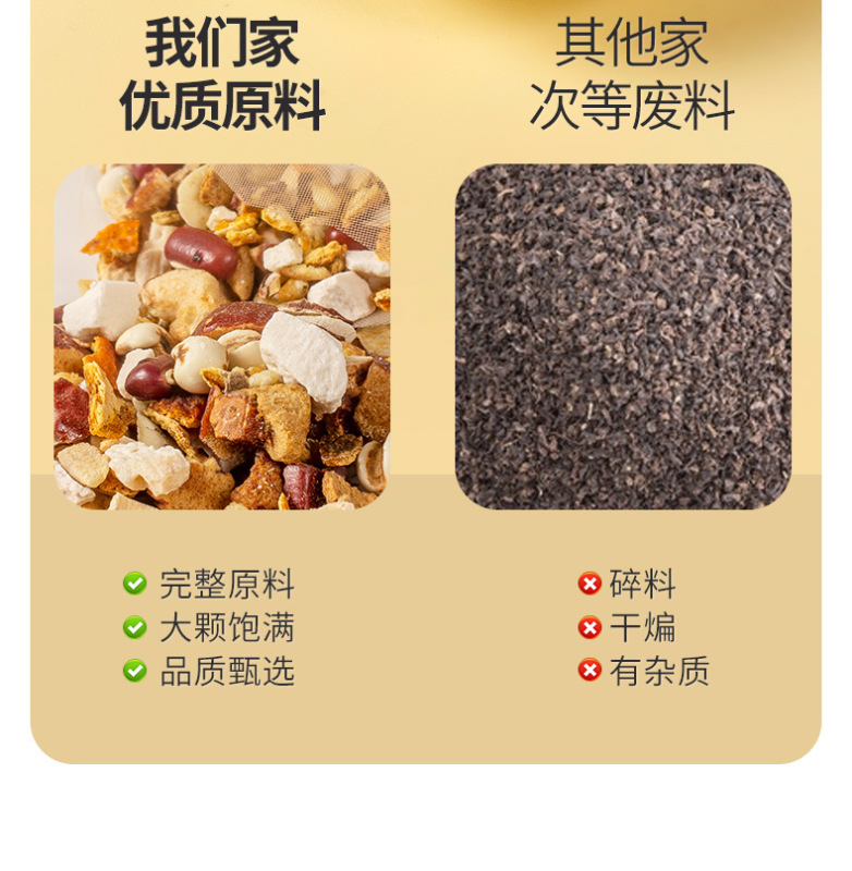 - Raw materials and ingredients: orange peel, red dates, bitter buckwheat, gorgon seeds, coix kernels, adzuki beans, poria, five-finger peach, lotus seeds, yam