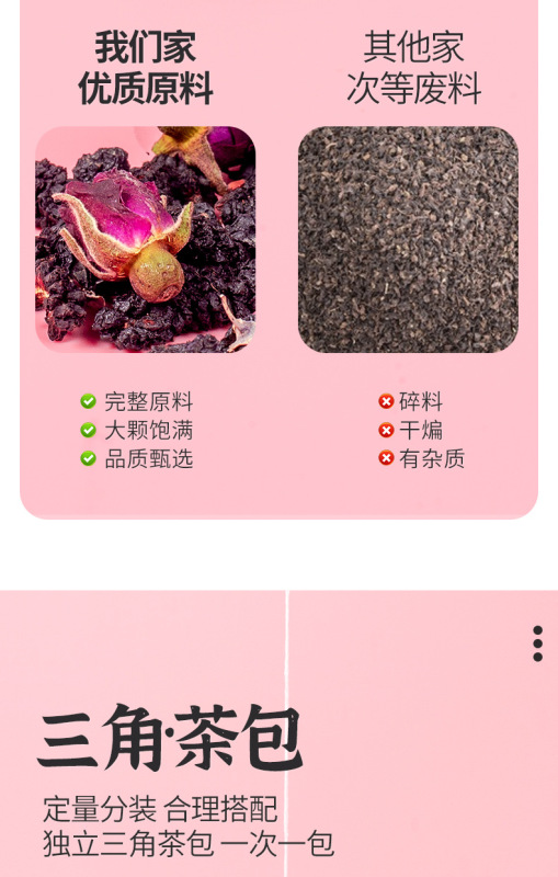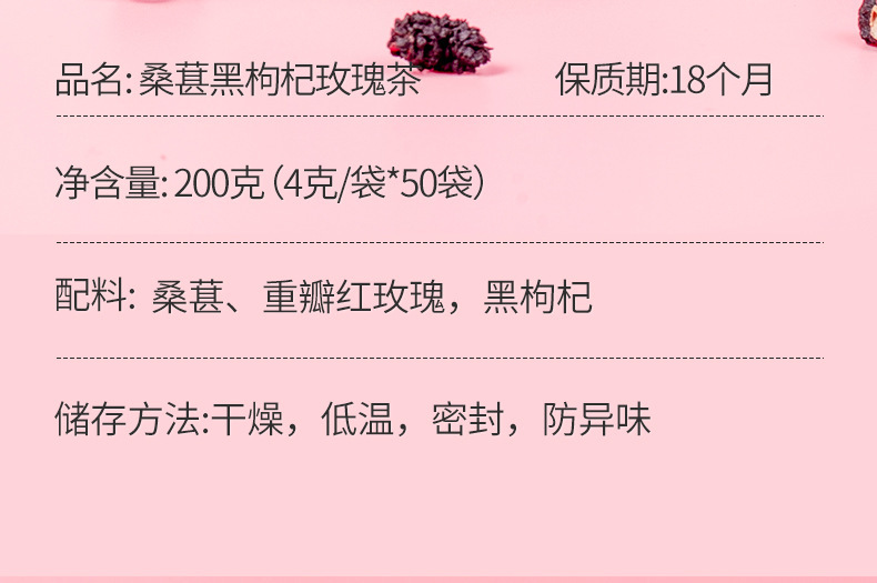 - Packaging specifications: Mulberry, black wolfberry, rose tea, 50 packs*4g