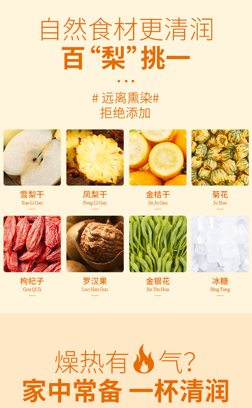 - 原料與配料:冰糖、雪梨乾、金桔干、鳳梨乾、枸杞子、菊花、羅漢果、金銀花