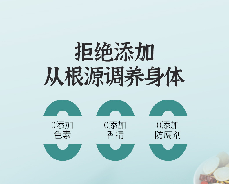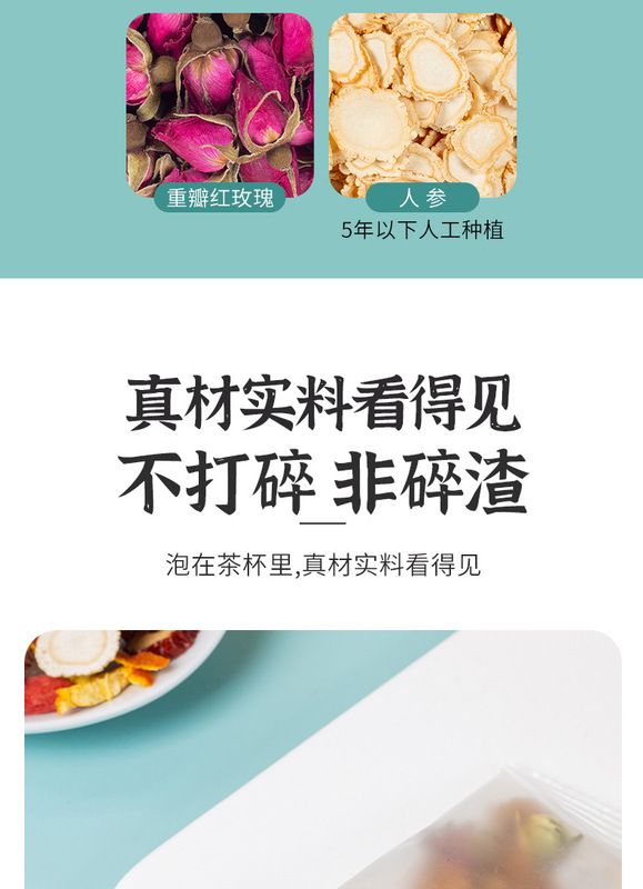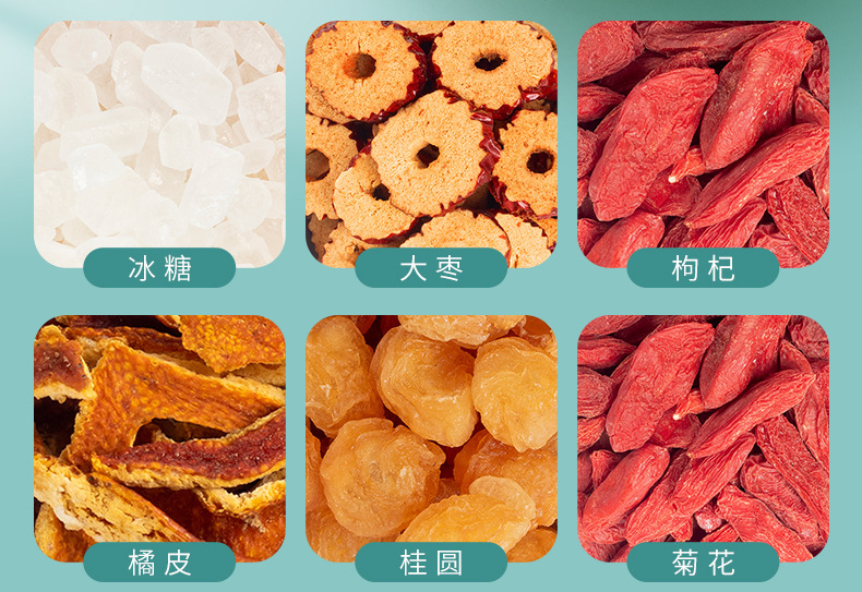 - Raw materials and ingredients: jujube, wolfberry, orange peel, longan, chrysanthemum, double red rose, rock sugar, ginseng (artificially grown under 5 years old)