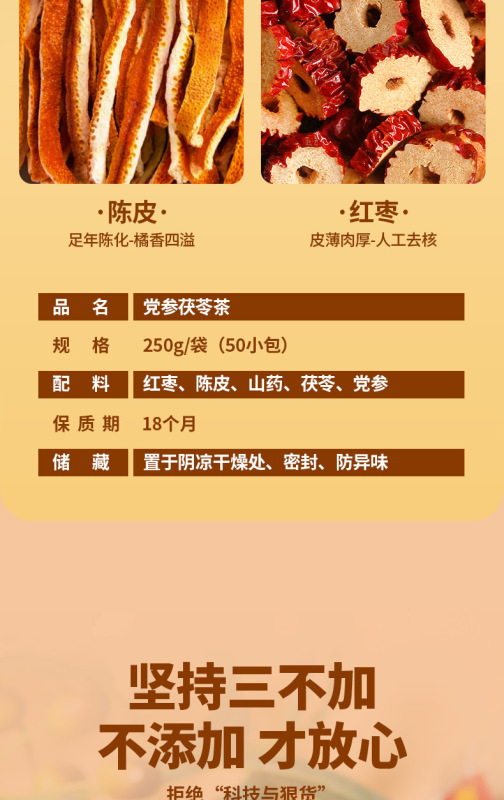 - 原料與配料:紅棗、陳皮、山藥、茯苓、黨參