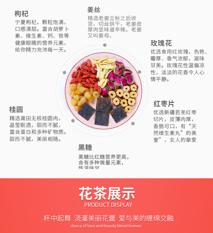 - 原料與配料:黑糖、紅棗、薑絲、重瓣紅玫瑰、桂圓、枸杞
