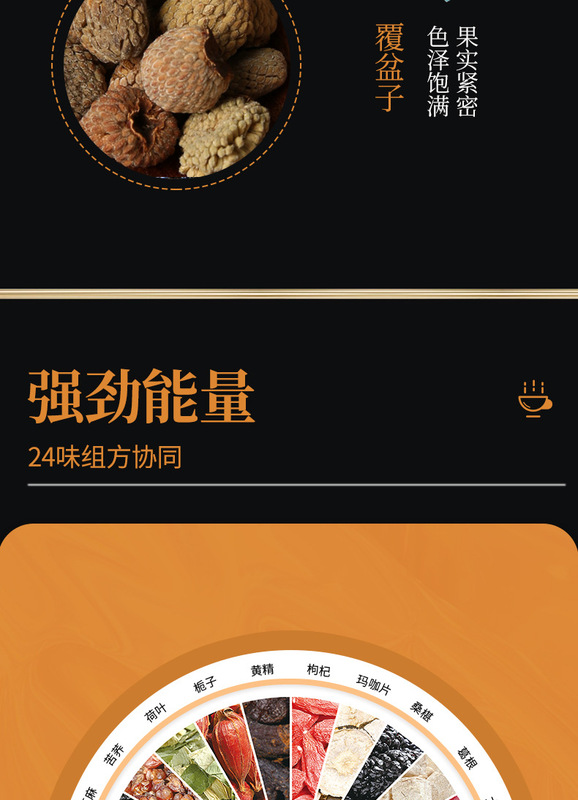 - Raw materials and ingredients: ginseng, polygonatum, mulberry, wolfberry, raspberry, gorgon fruit, eucommia male flower, etc.
