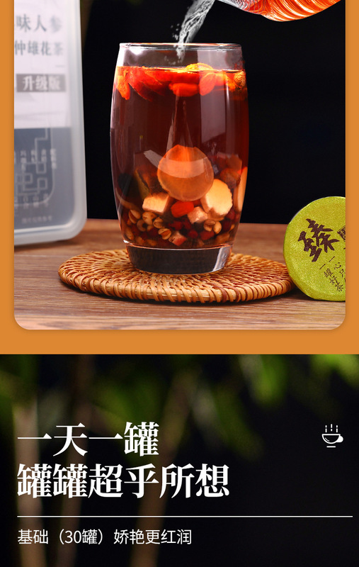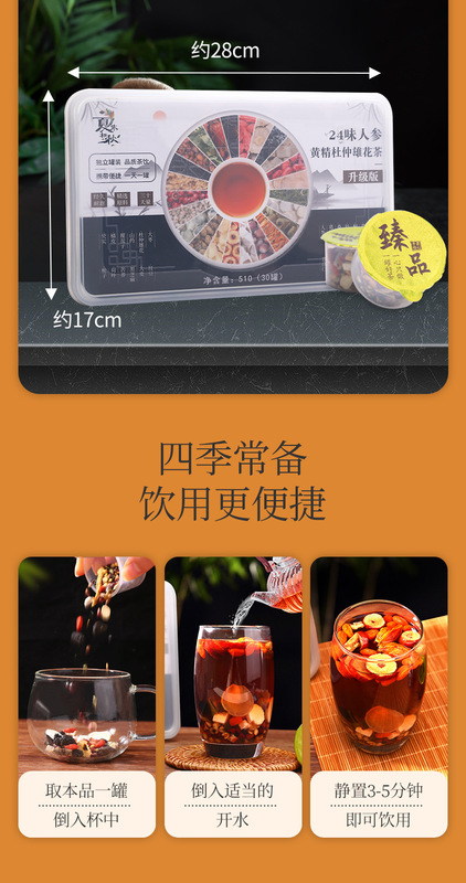 - Packaging specifications: 30 cans of 24 flavors of ginseng, polygonatum, eucommia and male flower tea