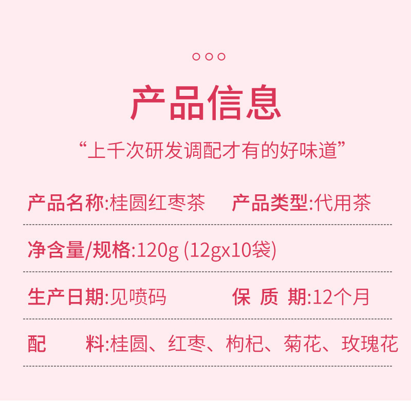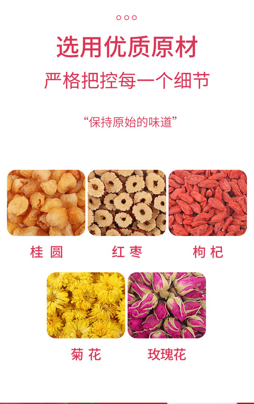 - Raw materials and ingredients: longan, red dates, wolfberry, chrysanthemum, rose