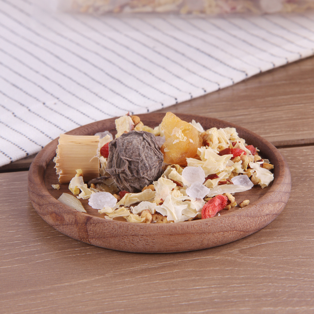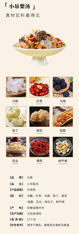 - Raw materials and ingredients: rock sugar, red dates, black plums, diced pears, white fungus, longan, lily, wolfberry, fresh reed root