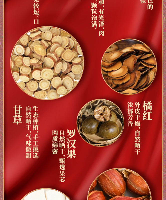- 原料與配料:決明子,枸杞,胖大海,桔紅,蒲公英根,百合,甘草,梔子,羅漢果,茯苓,菊花,金銀花