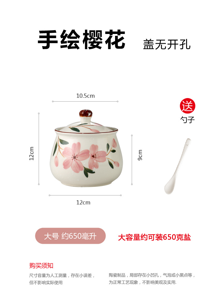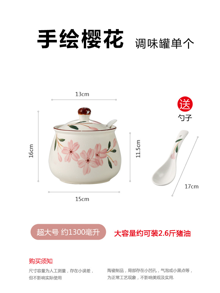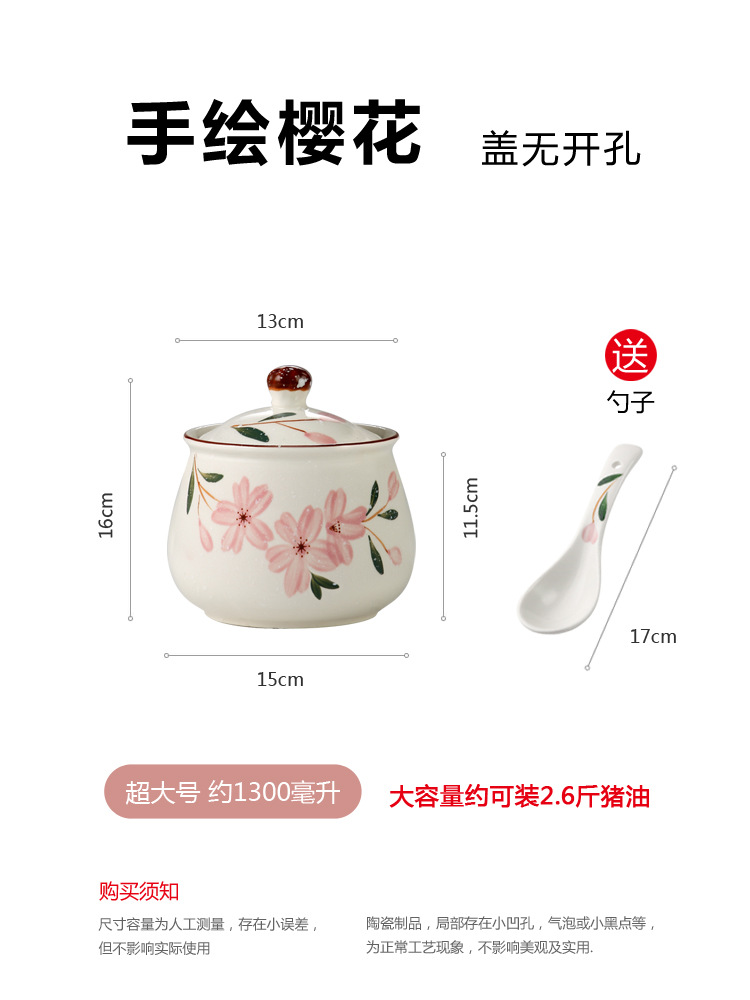 - 規格:單個大號櫻花調味罐+可裝一斤鹽約裝1斤豬油+送勺