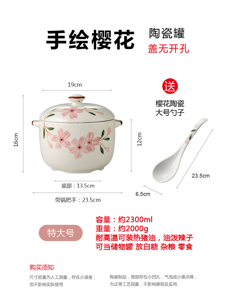 - 規格:特大號陶瓷罐2300ml(蓋無開孔)送櫻花陶瓷大勺子
