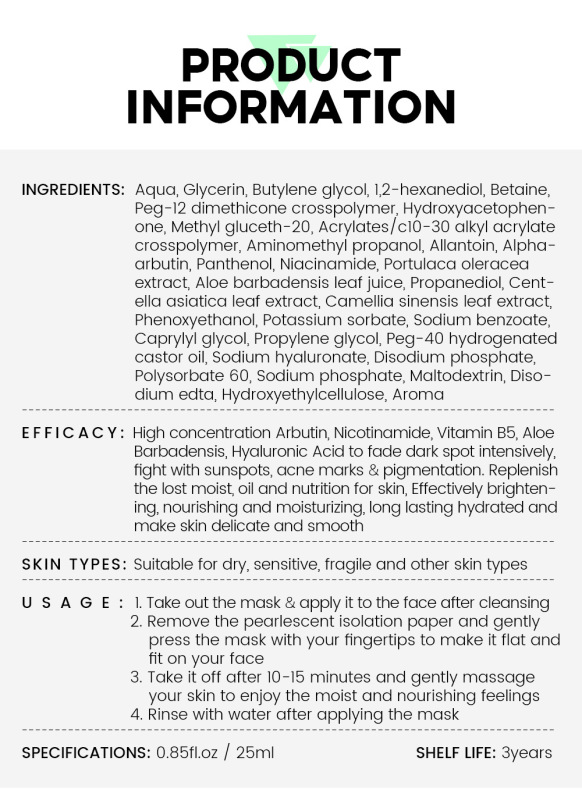 - 產品規格:熊果苷面膜25ml(單片裝)