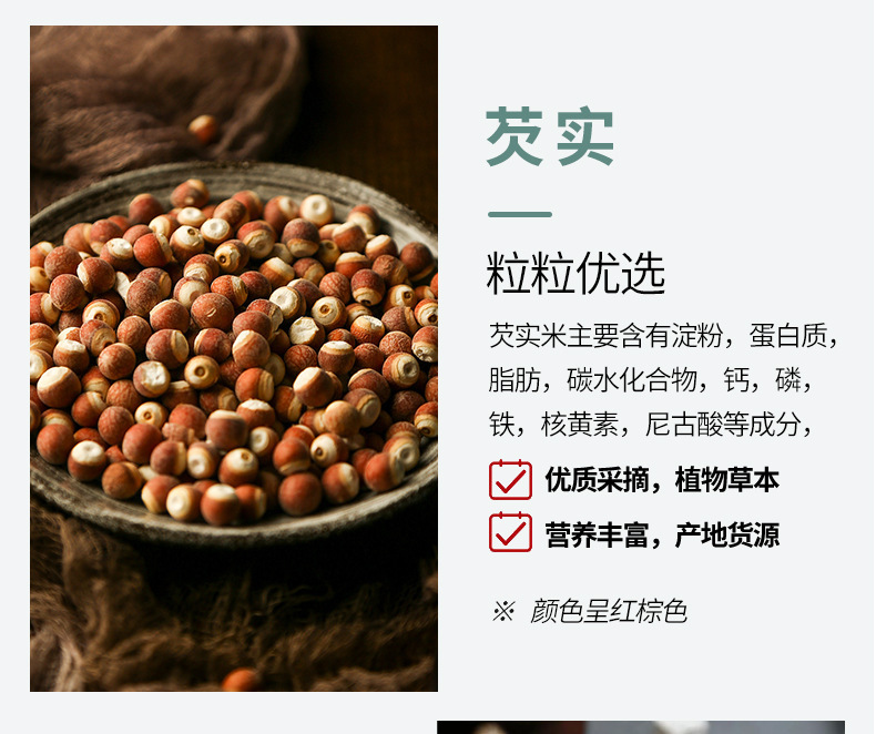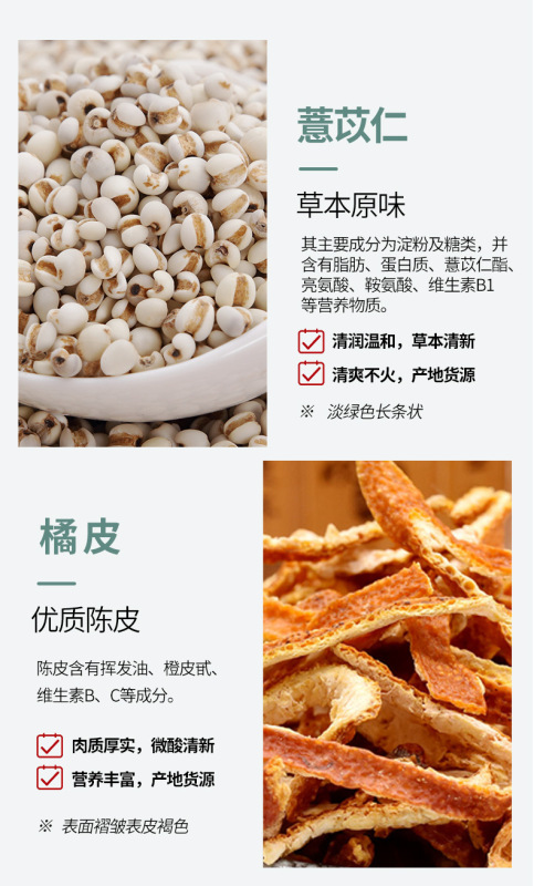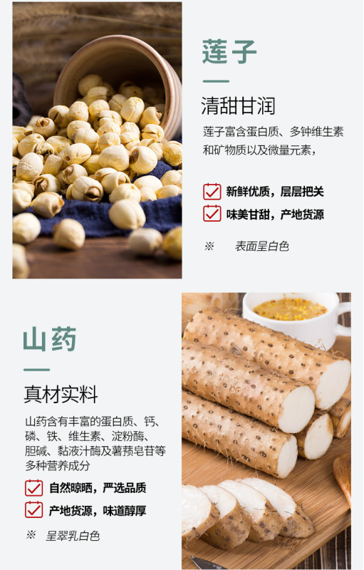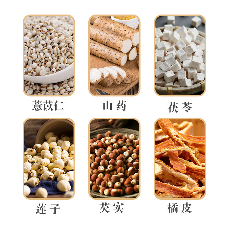 - Raw materials and ingredients: coix kernel, yam, poria, cocos and gorgon seeds, etc.