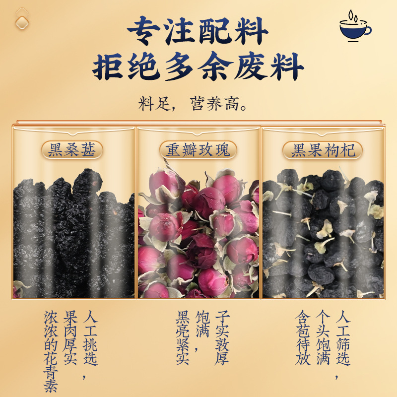- 原料與配料:桑葚、黑果枸杞、重瓣紅玫瑰