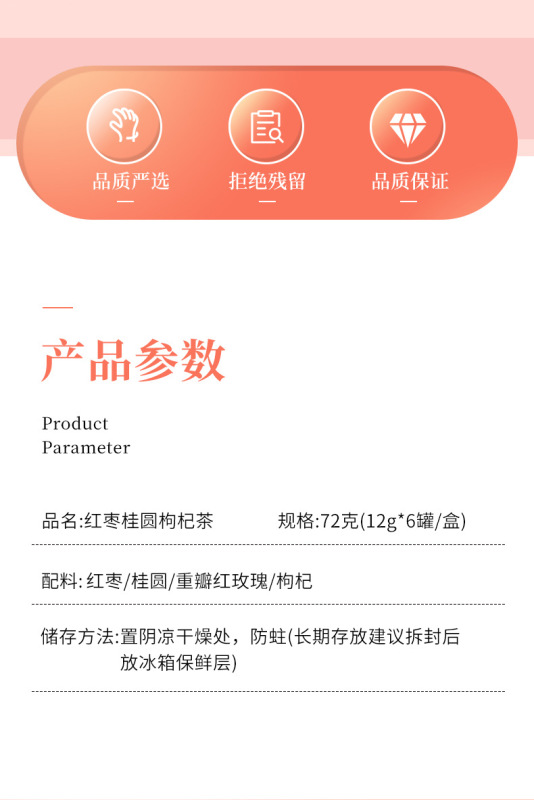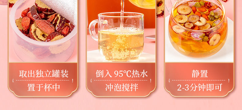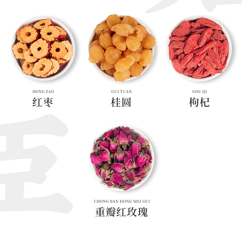 - Raw materials and ingredients: red dates, longan, double red rose, wolfberry