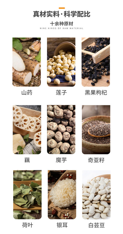 - Raw materials and ingredients: white kidney bean powder, lotus root powder, konjac powder, chia seed powder, lotus leaf, yam, white fungus, poria, lotus seed, acai berry powder, ebony powder, black wolfberry, inulin